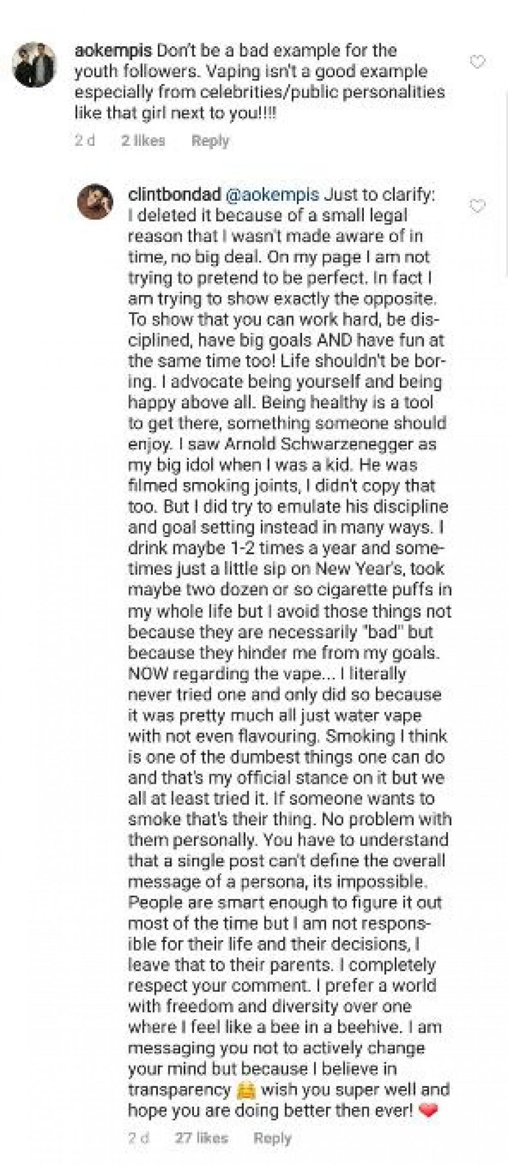 Instagram user @aokempis commented on the Clint's IG post and called out his remarks about vaping.