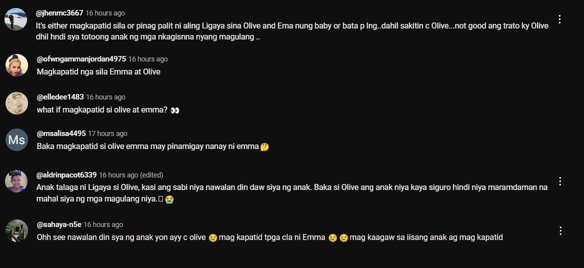 Ngunit ang netizens, may mga haka-haka sa totoong ibig sabihin ni Ligaya. Ang iba, sinabing maaaring magkapatid talaga sina Olive at Emma, habang ang iba naman ay sinabing baka pinagpalit din nito ang dalawa noong mga sanggol pa lang.