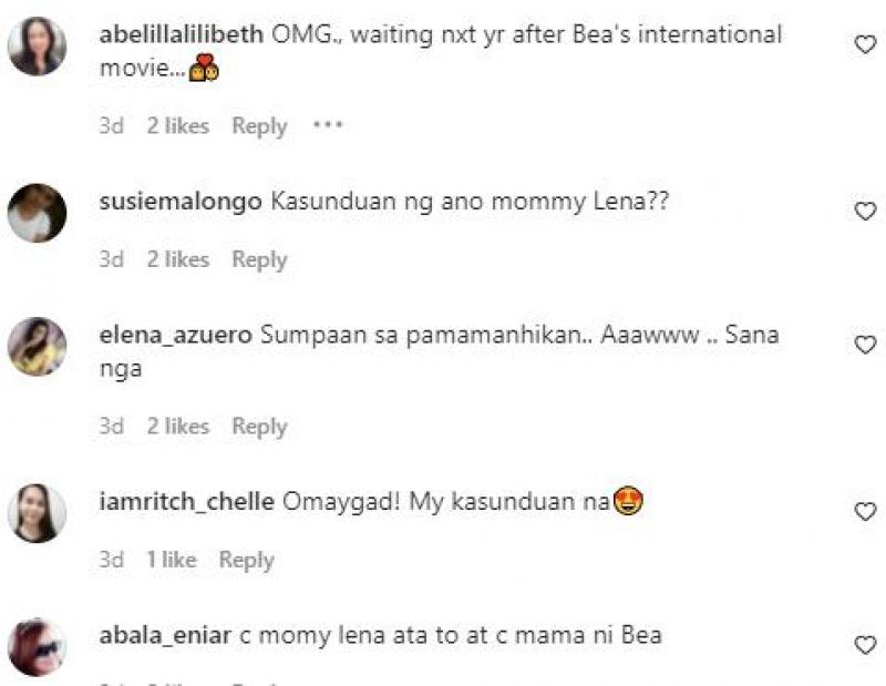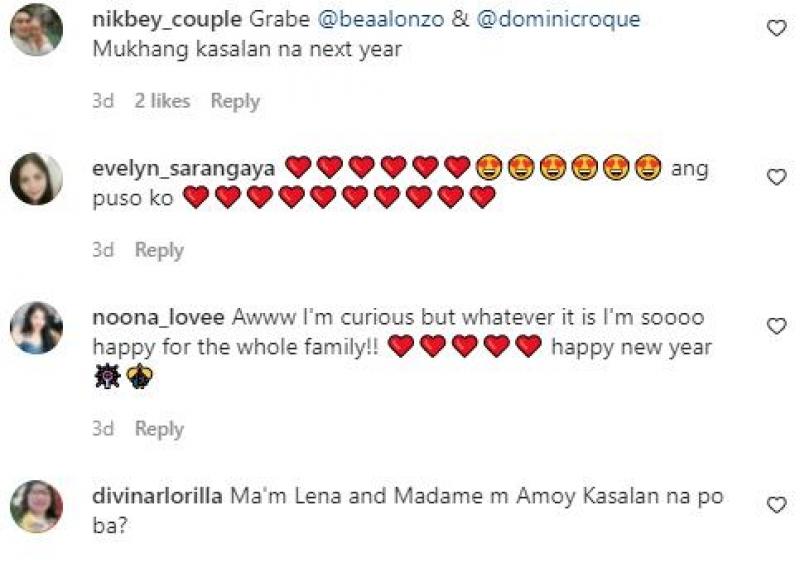 In an Instagram post, Dominic's mom Lena posted a photo of her hand gesturing a pinky promise against Bea's mom Mary Ann Ranollo at a gathering. The former sealed it with a puzzling caption, “Sumpaan at Kasunduan.”