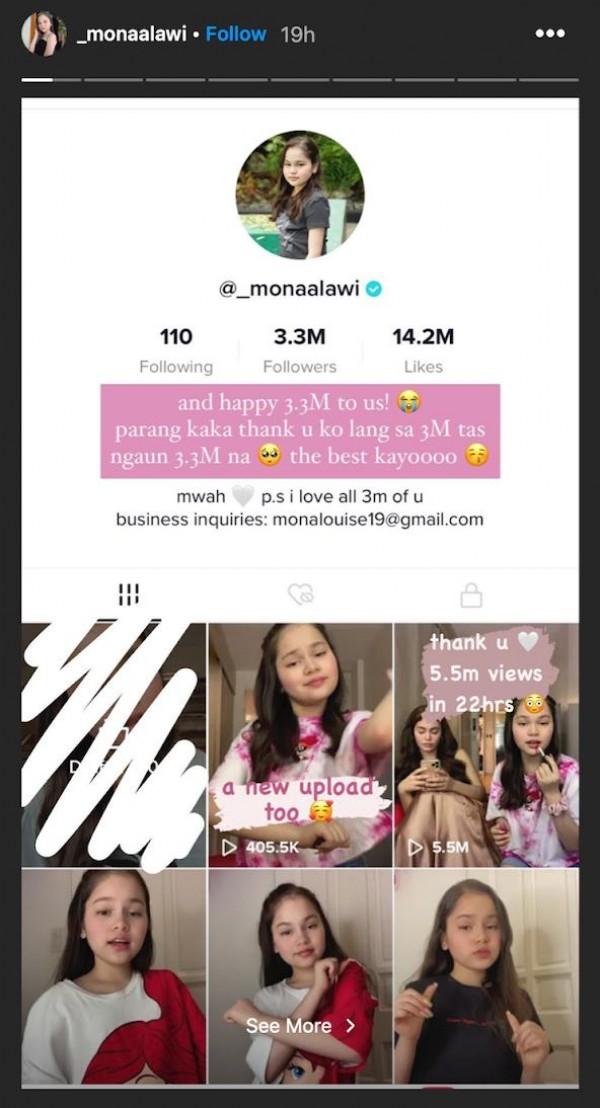 Kapuso child actress Mona Louise Rey thanked her followers for being supportive of her content on video-sharing social networking service Tiktok, Sunday, October 4.