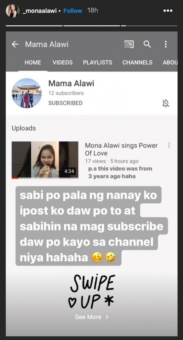 In an Instagram story, Mona told her followers that her mom ordered her to post promotions for the latter's new channel dubbed as “Mama Alawi.”