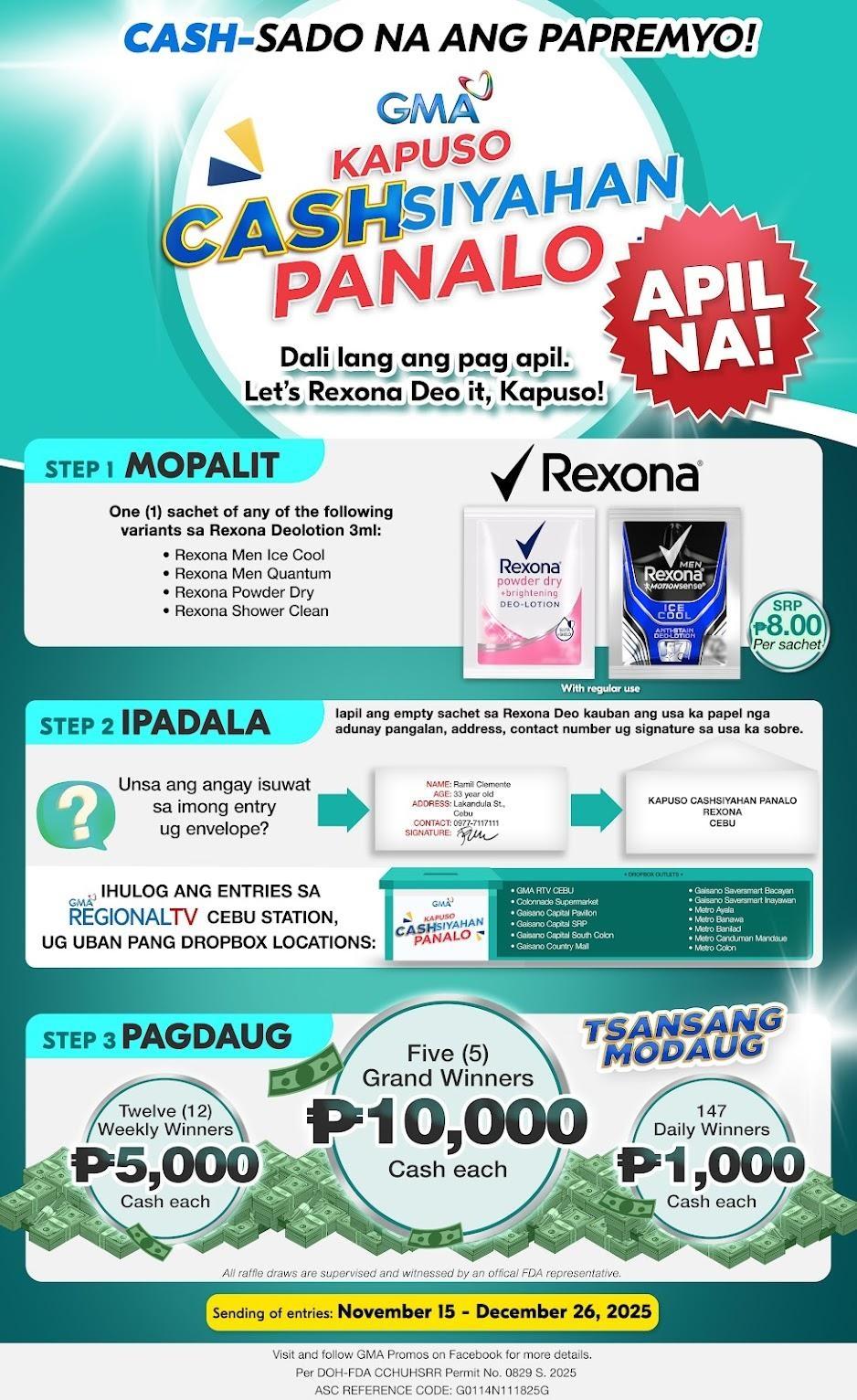 Kapuso fans in Cebu can join Kapuso Cashsiyahan Panalo by purchasing participating Rexona Deo-Lotion products. By sending in their entries, participants get the chance to be among the regional promo's 147 daily winners of Php 1,000, 12 weekly winners of Php 5,000, and, best of all, 5 winners of the grand prize of Php 10,000 in cash!