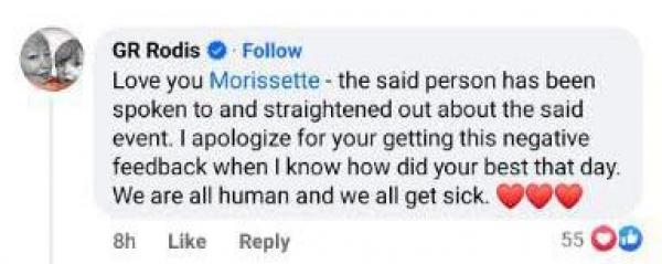 In the comments of the post, public relations professional Girlie Rodis wrote that the person “has been spoken to and straightened out” and apologized for the negative feedback Morissette received.