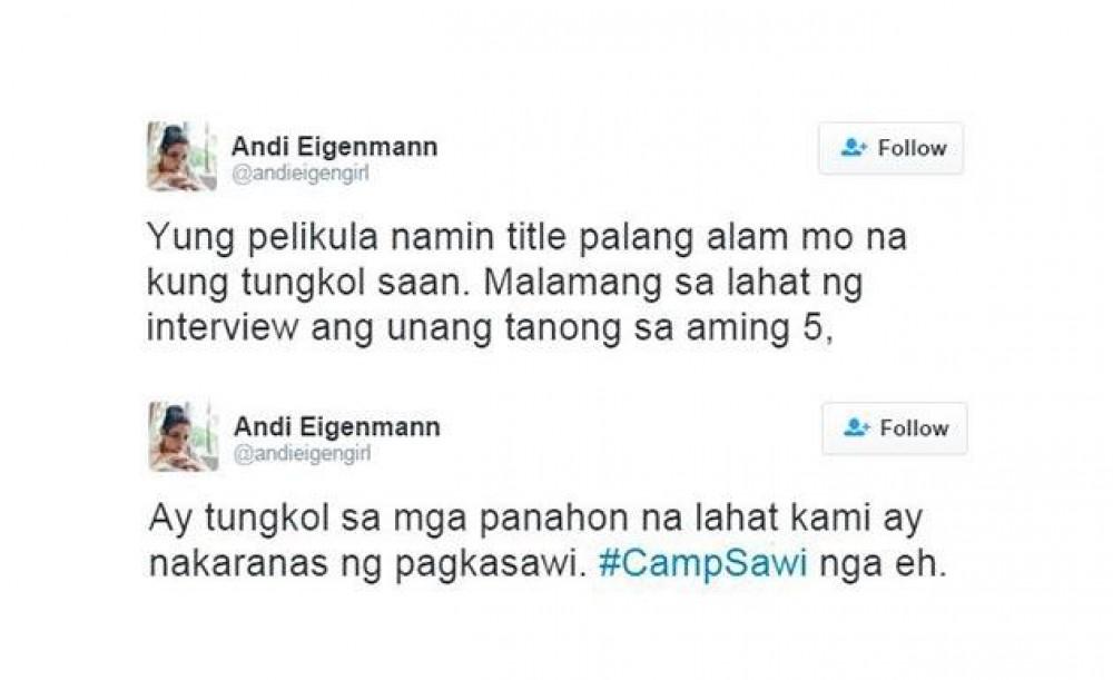 "'Yung pelikula namin title pa lang alam mo na kung tungkol saan. Malamang sa lahat ng interview ang unang tanong sa aming 5 ay tungkol sa mga panahon na lahat kami ay nakaranas ng pagkasawi. #CampSawi nga eh,” panimula ng kanyang tweets.