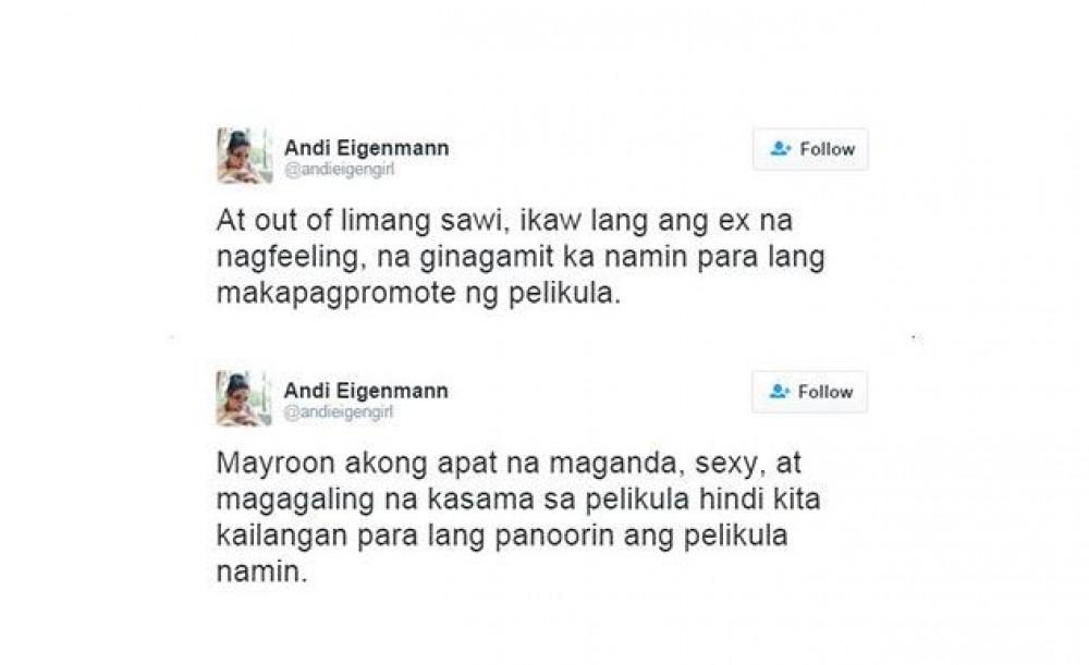 Sambit niya, “At out of limang sawi, ikaw lang ang ex na nag-feeling na ginagamit ka namin para lang makapag-promote ng pelikula. Mayroon akong apat na maganda, sexy, at magagaling na kasama sa pelikula. Hindi kita kailangan para lang panooring ang pelikula namin.”