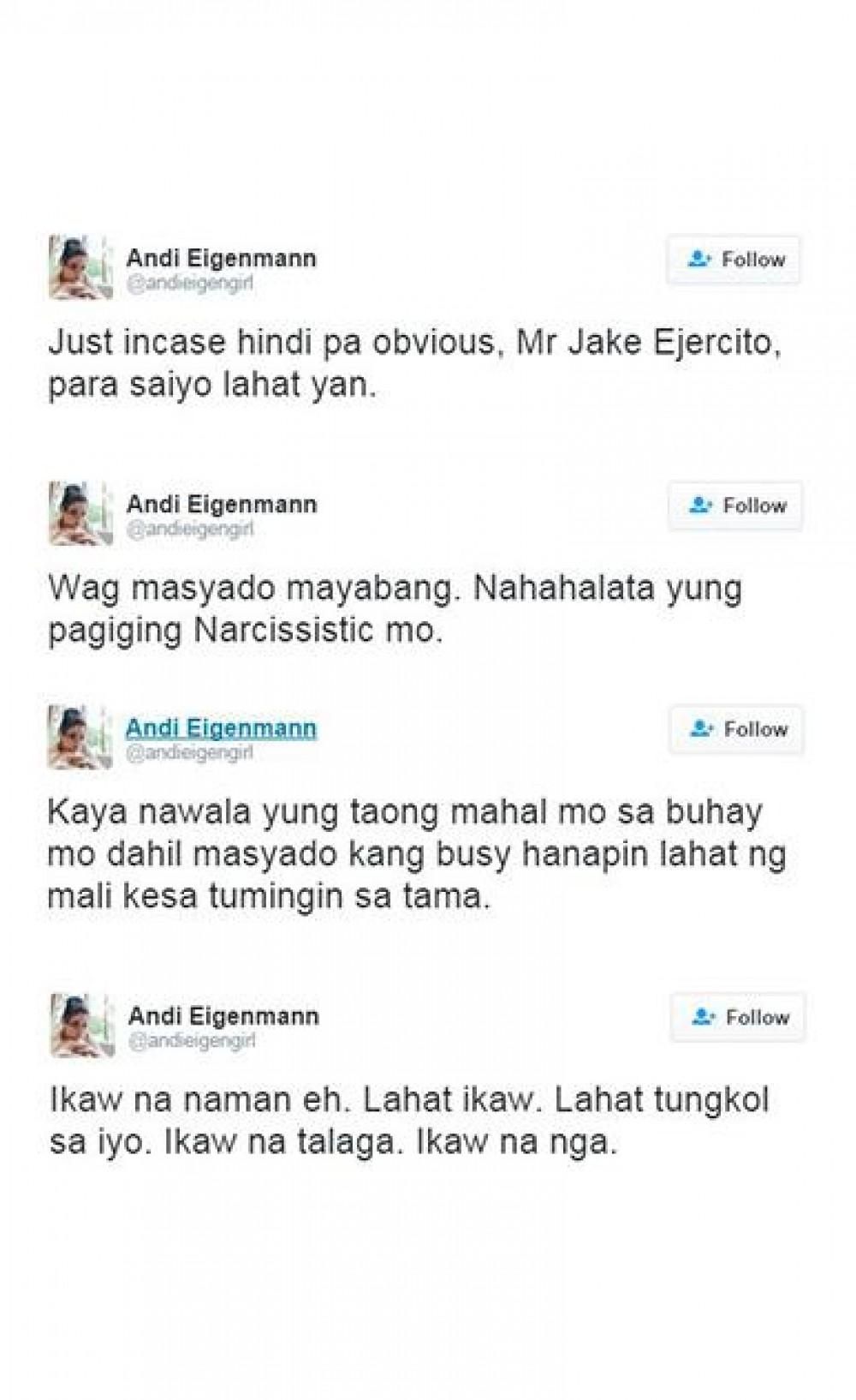 Sunod-sunod ang pagbitaw ng mabibigat na pahayag ni Andi Eigenmann sa Twitter ngayong araw at hindi itinanggi ng aktres na ang mga ito ay para sa kanyang dating nobyong si Jake Ejercito.