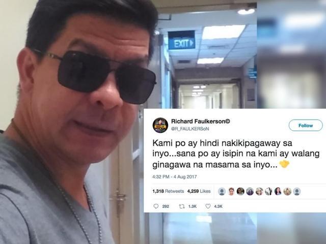Maikli at kalmado ang tono ng Twitter post ni Daddy Bae, "Kami po ay hindi nakikipagaway sa inyo...sana po ay isipin na kami ay walang ginagawa na masama sa inyo..."