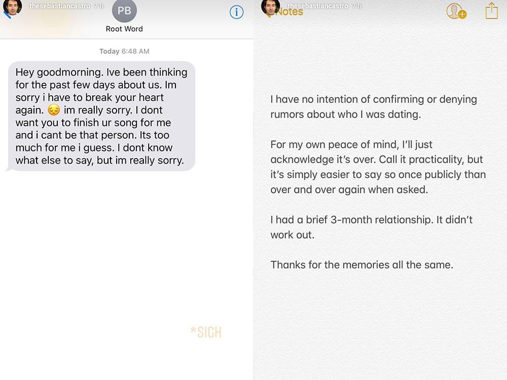 Kagabi (June 23), binasag ni Sebastian Castro ang kanyang katahimikan at sinabing nanggaling siya sa isang “brief 3-month relationship” pero hindi ito nag-work out. Wala raw siyang balak na kumpirmahin or itanggi ang kanyang dating rumored boyfriend.
