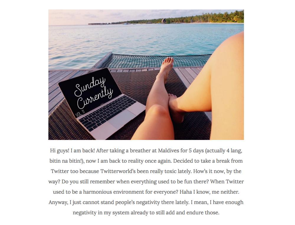 She wrote, “Hi guys! I am back! After taking a breather at Maldives for 5 days (actually 4 lang, bitin na bitin!), now I am back to reality once again. Decided to take a break from Twitter too because Twitterworld’s been really toxic lately. How’s it now, by the way? Do you still remember when everything used to be fun there? When Twitter used to be a harmonious environment for everyone? Haha I know, me neither.”