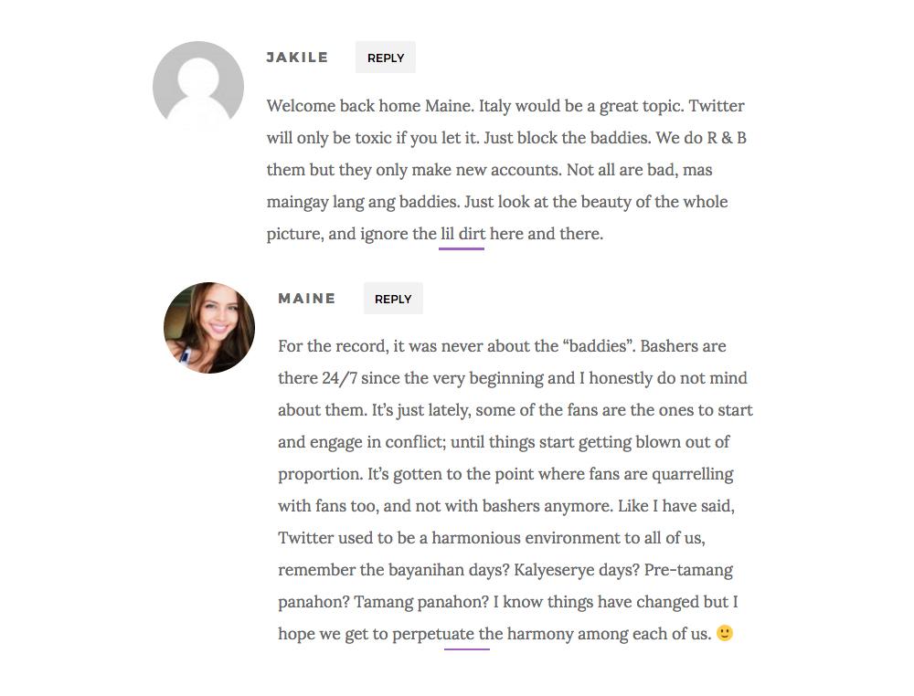 In her blog post on June 11, Maine didn’t mince her words and expressed her dismay over the toxic environment she experienced in the social media site.