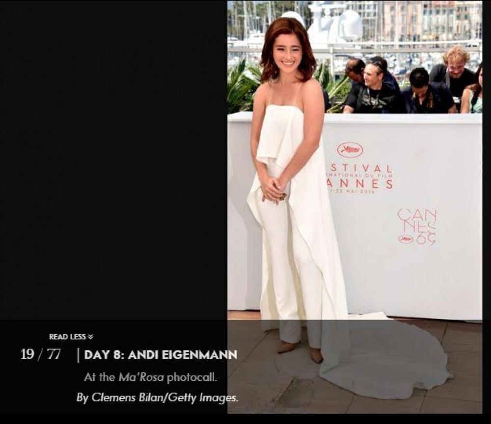 Andi Eigenmann turned heads as she walked down the red carpet of the 2016 Cannes Film Festival in France. The young actress was named by the magazine Vanity Fair among the 77 best dressed celebrities at the prestigious event.