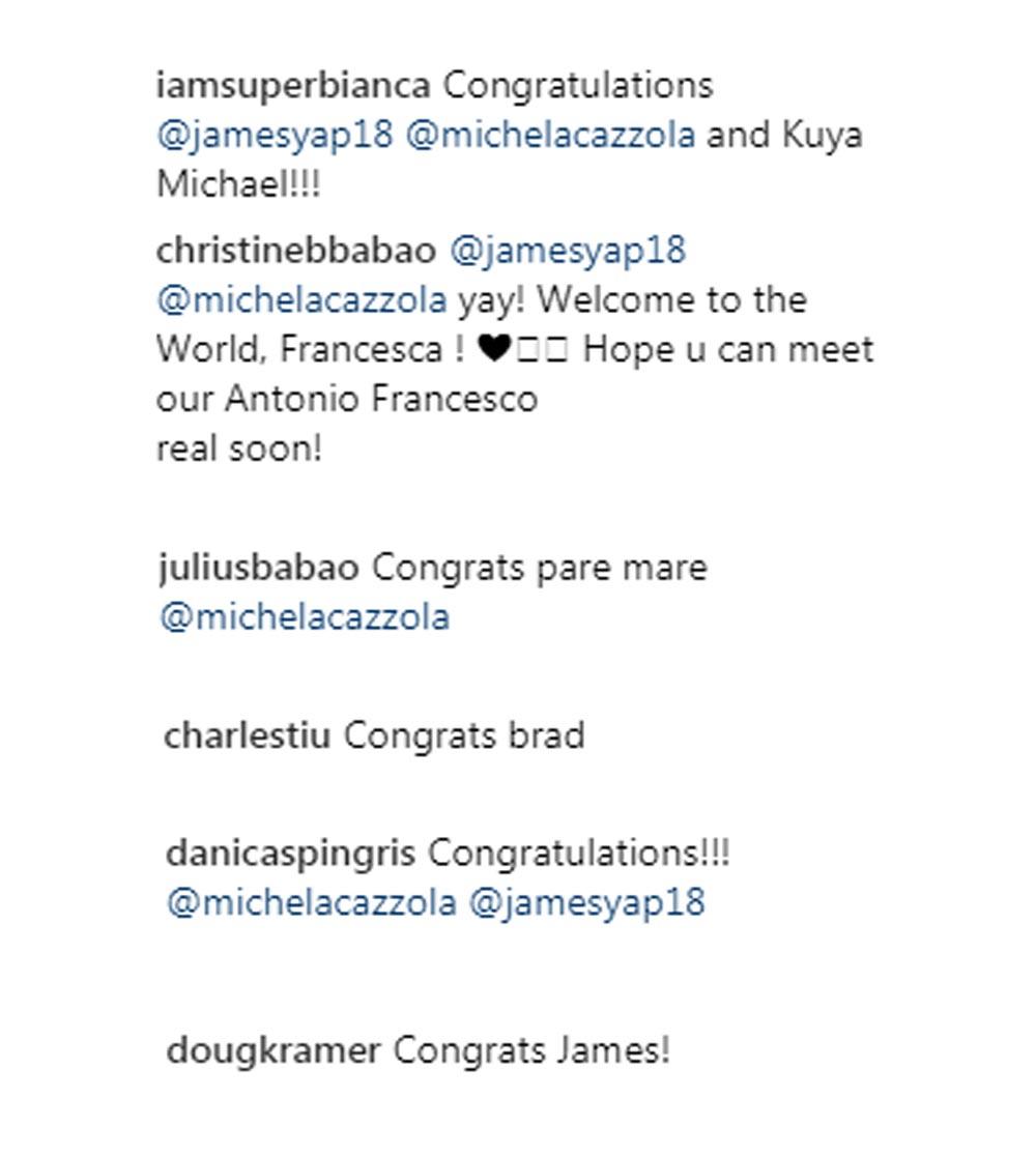 PBA cager James Yap and Italian girlfriend Michela Cazzola welcomed their second child, a healthy baby girl they named Francesca Michelle, yesterday (June 27).