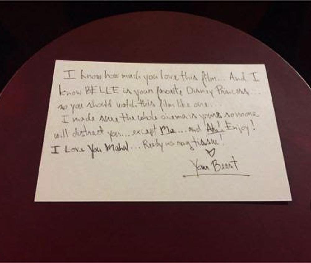His letter read, “I know how much you love this film.. And I know Belle is your favorite Disney Princess. So you should watch this film like one. I make sure the whole cinema is yours so no one will distract you.. except me and Aki! Enjoy! I love you, Mahal. Ready na ang tissue. (Love), your Beast.”