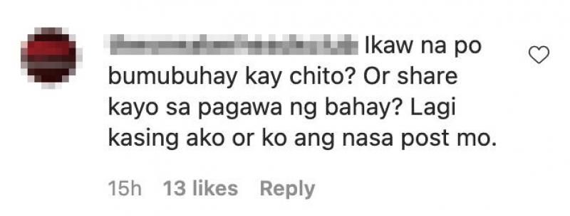 The netizen asked, “Ikaw na po bumubuhay kay Chito? Or share kayo sa paggawa ng bahay? Lagi kasing ako or ko ang nasa post mo.”