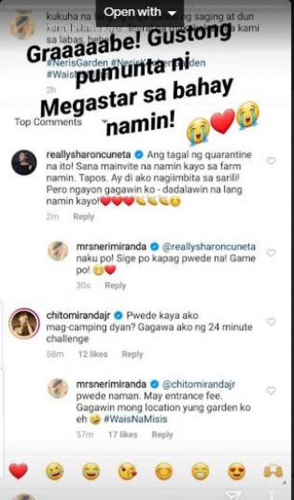 In one of her posts, the actress/singer commented on Neri's post that once the modified enhanced community quarantine has been lifted she would visit Neri and Chito Miranda's home in Cavite.