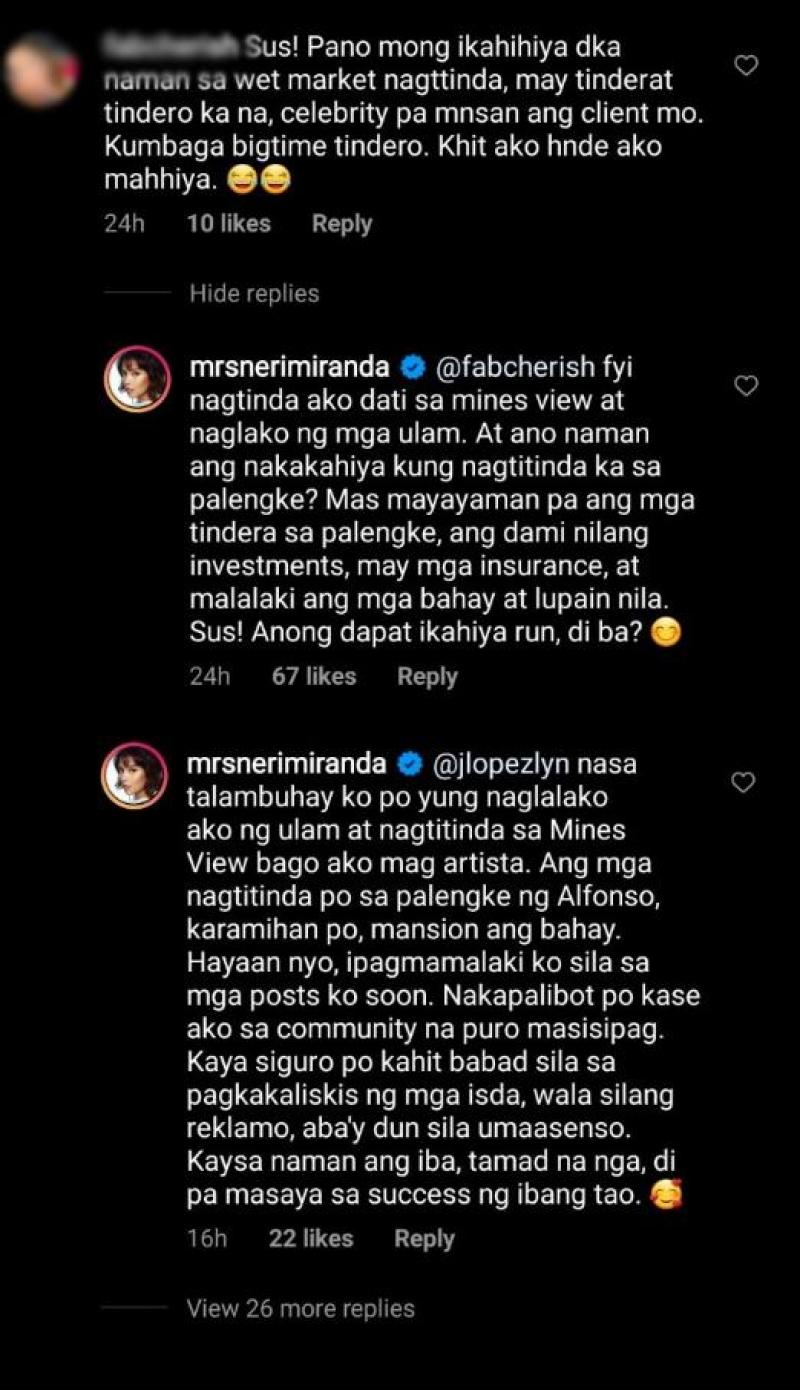 Paliwanag niya, “@jlopezlyn Nasa talambuhay ko po 'yung naglalako ako ng ulam at nagtitinda sa Mines View bago ako nag artista. Ang mga nagtitinda po sa palengke ng Alfonso, karamihan po, mansion ang bahay.