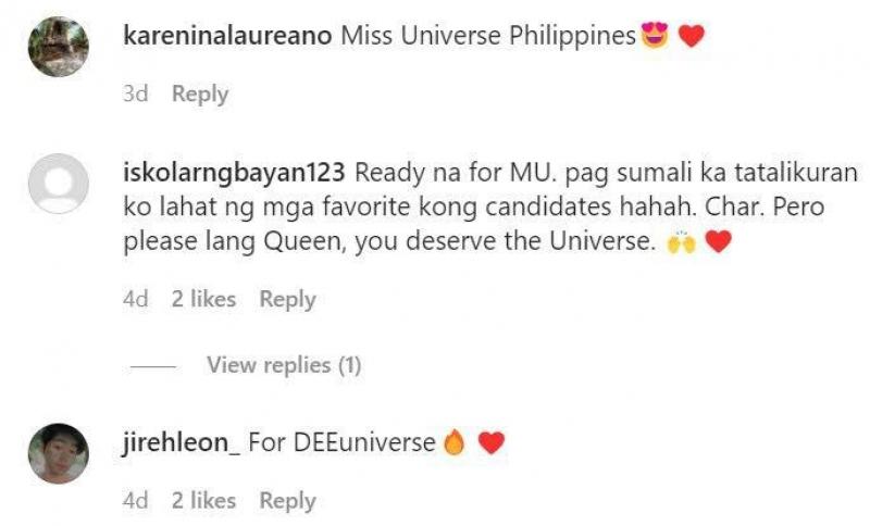 Instagram user @iskolarngbayan123 jokingly promised that if Michelle were to compete in the pageant, he would abandon his favorite candidates, saying that Michelle deserves “the Universe.”