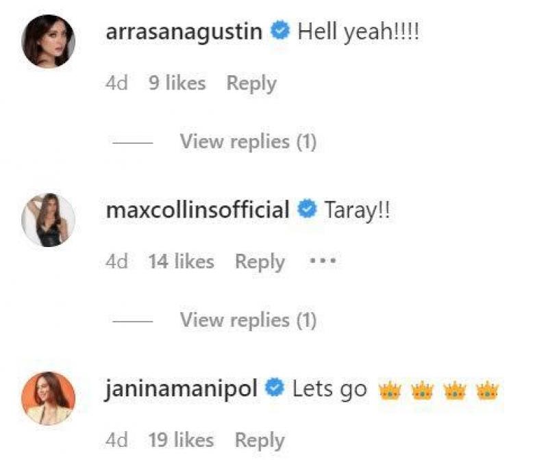 Perhaps the only people not speculating on Michelle's beauty pageant plans in the comments section are her fellow actresses Arra San Agustin and Max Collins, who commented “Hell yeah!!!!” and “Taray!!” respectively. Entrepreneur Janina Manipol, on the other hand, just left crown emojis, which could be up to interpretation