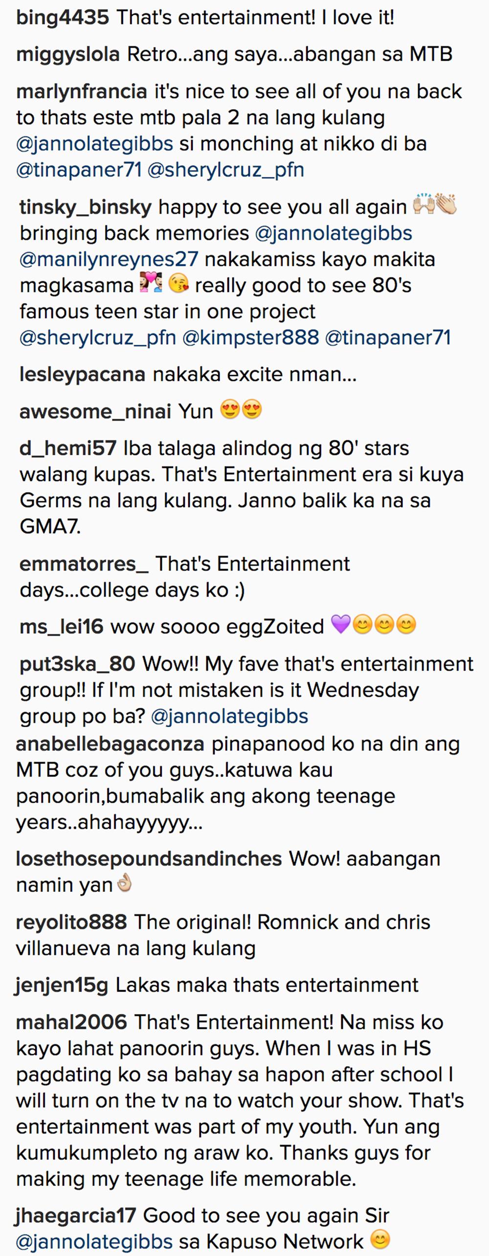 Maraming netizens ang natuwa na muling mapanood ang tinaguriang Philippine King of Soul at “pinakamagandang lalaki sa mundo” sa Kapuso network. Marami rin ang na-excite sa tila naging reunion ni Janno kasama ang iba ring dating members ng That’s Entertainment na sina Keempee de Leon, Manilyn Reynes, Tina Paner at Sheryl Cruz.