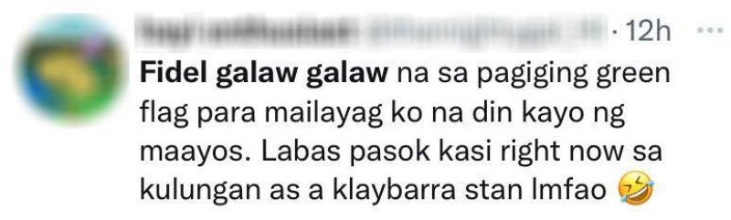 Another wrote, "Fidel galaw galaw na sa pagiging green flag para mailayag ko na din kayo ng maayos. Labas pasok kasi right now sa kulungan as a klaybarra stan lmfao.”