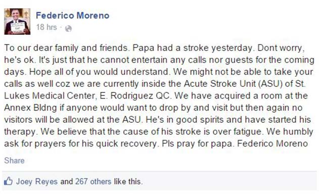 “To our dear family and friends. Papa had a stroke yesterday. Dont worry, he's ok. It's just that he cannot entertain any calls nor guests for the coming days. Hope all of you would understand. We might not be able to take your calls as well coz we are currently inside the Acute Stroke Unit (ASU) of St. Lukes Medical Center, E. Rodriguez QC. We have acquired a room at the Annex Bldng if anyone would want to drop by and visit but then again no visitors will be allowed at the ASU. He's in good spirits and have started his therapy. We believe that the cause of his stroke is over fatigue. We humbly ask for prayers for his quick recovery. Pls pray for papa. Federico Moreno”