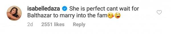 In the comments section, Isabelle Daza wrote that she is excited to have her son, Balthazar, to be part of the Bolzico family.