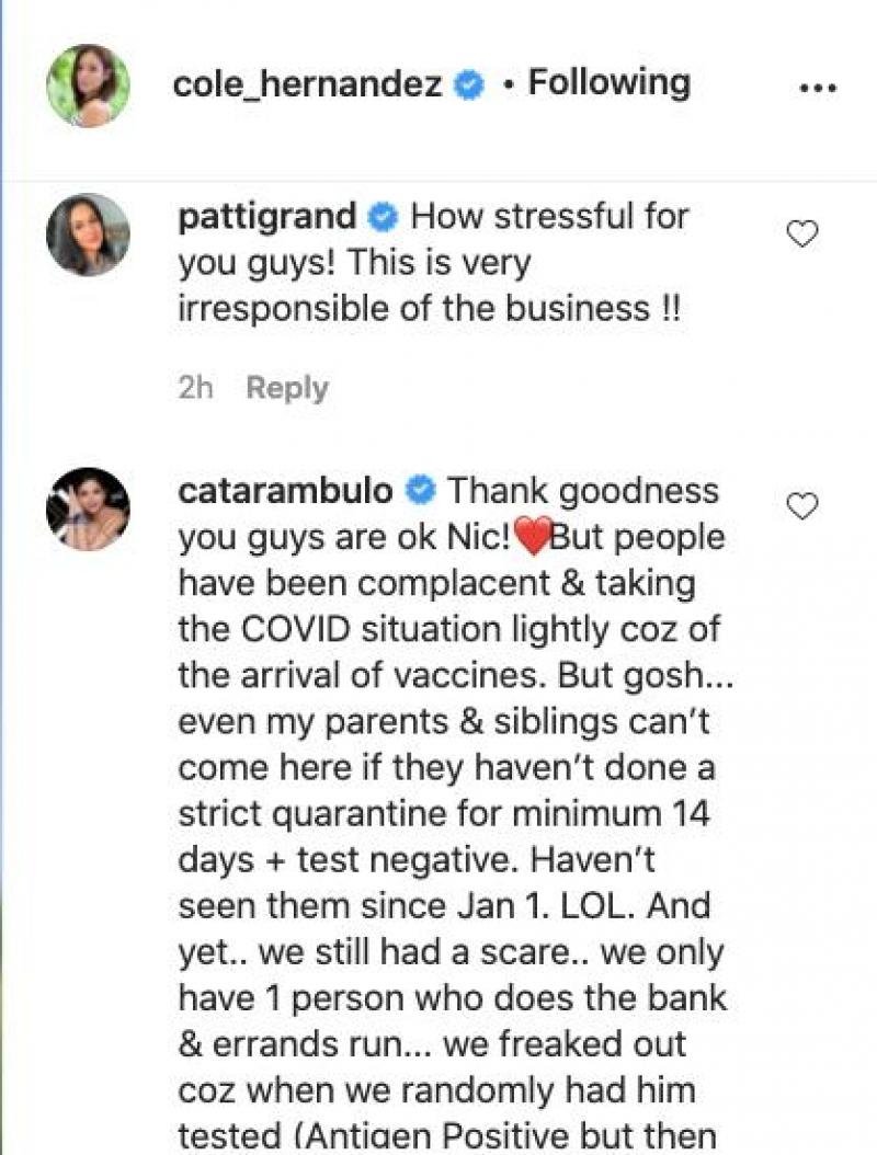 Her friend, entrepreneur, and fellow influencer, Cat Arambulo-Antonio also shared in the comments that her family also had a COVID scare. And although they all tested negative, they still quarantined themselves.
