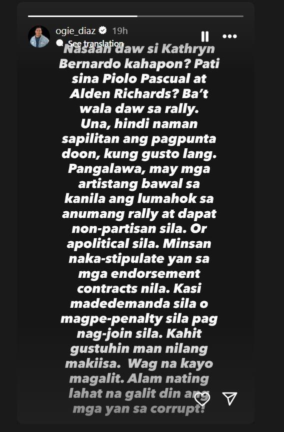 “Nasaan daw si Kathryn [Bernardo] kahapon? Pati sina Piolo Pascual at Alden Richards? Ba't wala daw sa rally. Una, hindi naman sapilitan ang pagpunta doon, kung gusto lang.” paglilinaw ni Ogie sa Instagram Story.