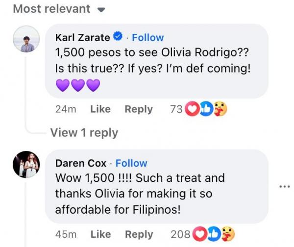A Facebook user wrote, “1,500 pesos to see Olivia Rodrigo?? Is this true?? If yes? I'm def coming!”