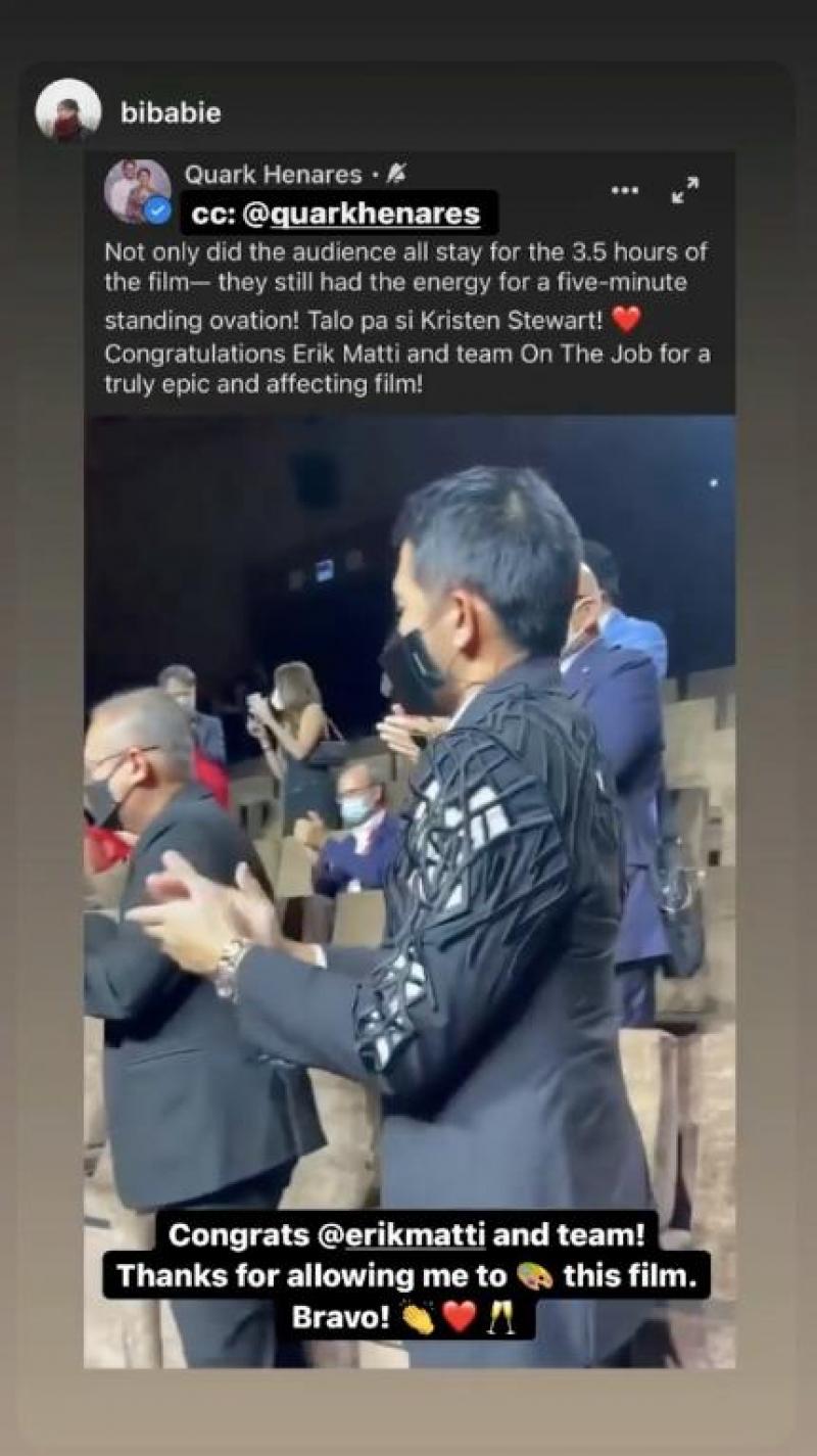 Sa Instagram stories ng digital colorist na si Biba Abiera, makikitang pinapalakpan ng audience at jury members sina Direk Erik Matti, Dennis Trillo, at iba pang bumubuo ng pelikula.