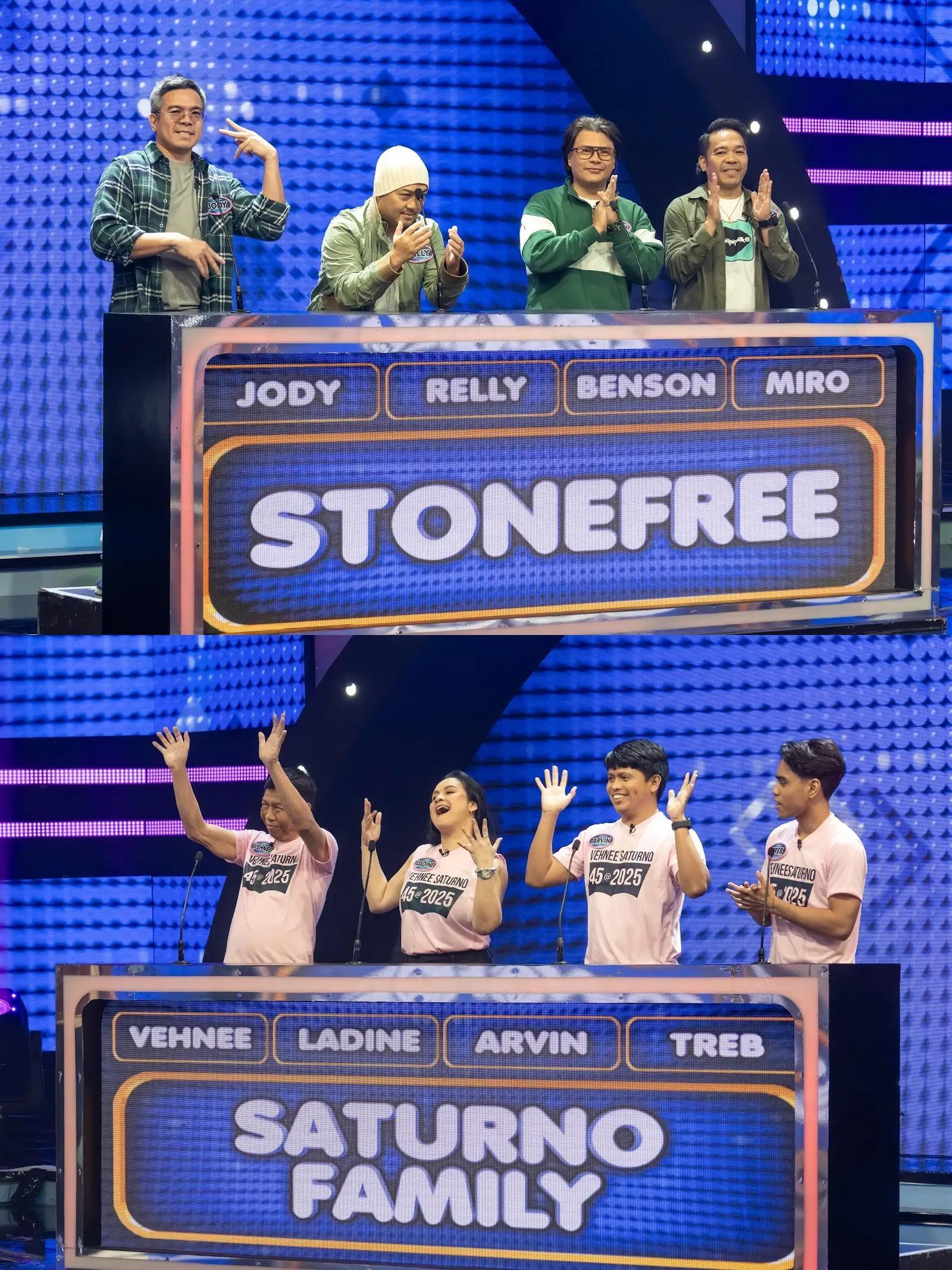 Makakasama niya sa Family Feud ngayong November 26 ang asawa at voice of Asia grand champion, recording artist and voice coach na si Ladine Roxas-Saturno; ang pamangkin at digital consultant ng Saturno Music na si Arvin Saturno; at ang apo at call center agent na si Treb Saturno.