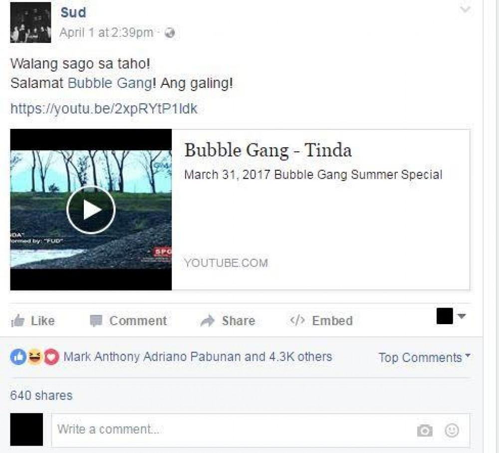 Nagustuhan naman ng Sud ang version ni Bitoy ng kanta nila na may title na ‘Tinda’ base sa post nila sa kanilang official Facebook account.
