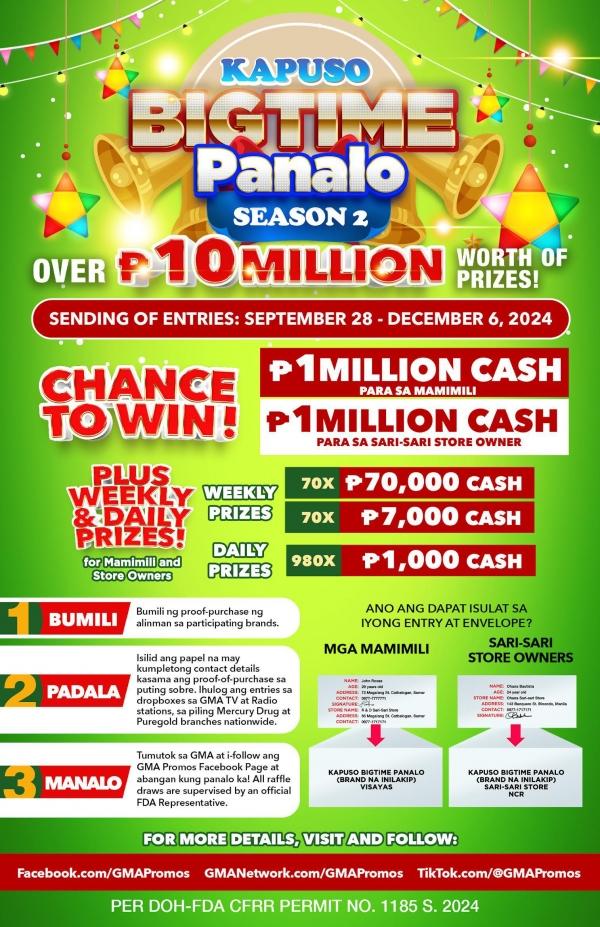 Starting September 28, mamimili and sari-sari store owners nationwide can join the second season of Kapuso Bigtime Panalo. With bigger prizes this time around, the promo will give participants a chance to win the Php 1 million grand prize (Php1 Million each for mamimili and store owner), along with other cash prizes. Christmas will definitely come early for 70 lucky winners of Php 70,000, 70 winners of Php 7,000, and 980 winners of Php 1,000!