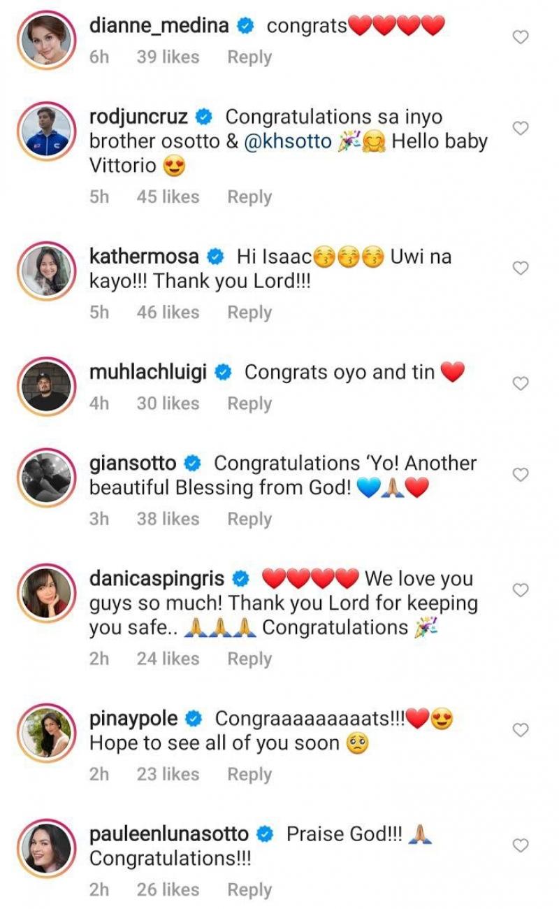 Their relatives such as Oyo's sister Danica Sotto-Pingris, cousins Gian and Ciara Sotto, his stepmom Pauleen Luna-Sotto, and Kristine's sister Kathleen Hermosa congratulated the celebrity couple for their newborn child.