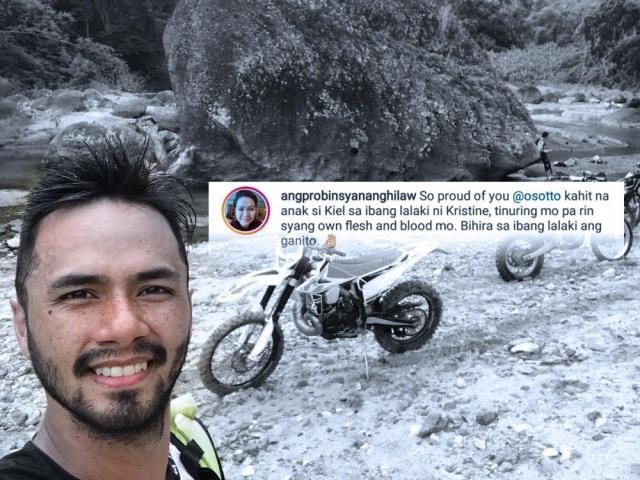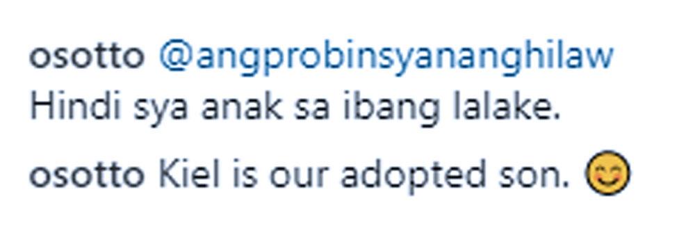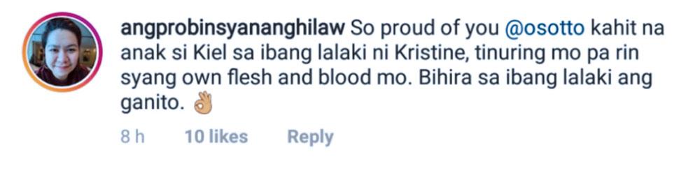 Ayon sa binura nang komento ng netizen na may handle na @angprobinsyananghilaw, “So proud of you @osotto kahit na anak ni Kiel sa ibang lalaki ni Kristine, tinuring mo pa rin siyang own flesh and blood mo. Bihira sa ibang lalaki ang ganito.”