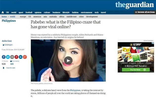 UK news website The Guardian featured the pabebe wave made popular of Alden Richards and Maine Mendoza a.k.a Yaya Dub in the hit kalye-serye of 'Eat Bulaga.'