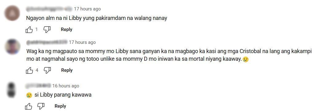 Iba rin ang naging epekto kay Libby ng pangungutya ng mga kaklase niya dahil kalat na kalat nang kriminal ang tunay niyang ina na si Divina.