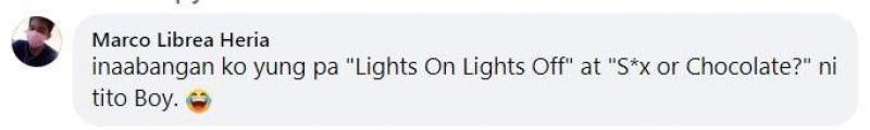 “Inaabangan ko 'yung pa 'Lights On Lights Off' at 'S*x or Chocolate?' ni Tito Boy [laughing emoji],” ani nito.