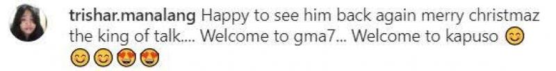 “Happy to see him back again, Merry Christmas the King of Talk. Welcome to GMA-7.Welcome to Kapuso,” mensahe ng isang fan.