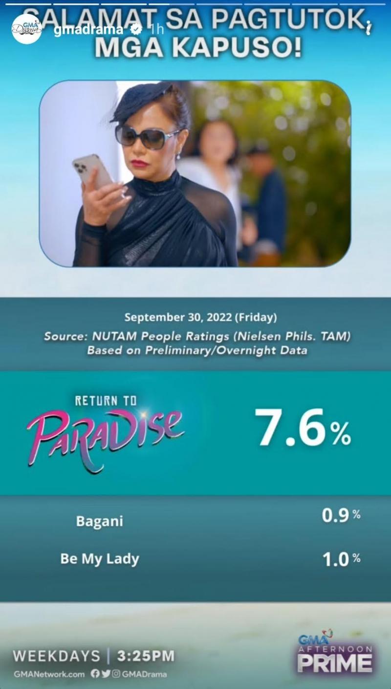 Sa episode na ito, nakapagtala ang Return To Paradise ng 7.6 percent ratings, ayon sa NUTAM People Ratings ng pinagkakatiwalaang market research firm na Nielsen Philippines.