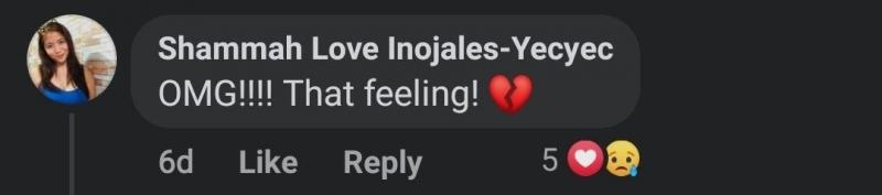 “OMG!! That feeling (broken-hearted emoji),” comment ni Shammah Yecyec.