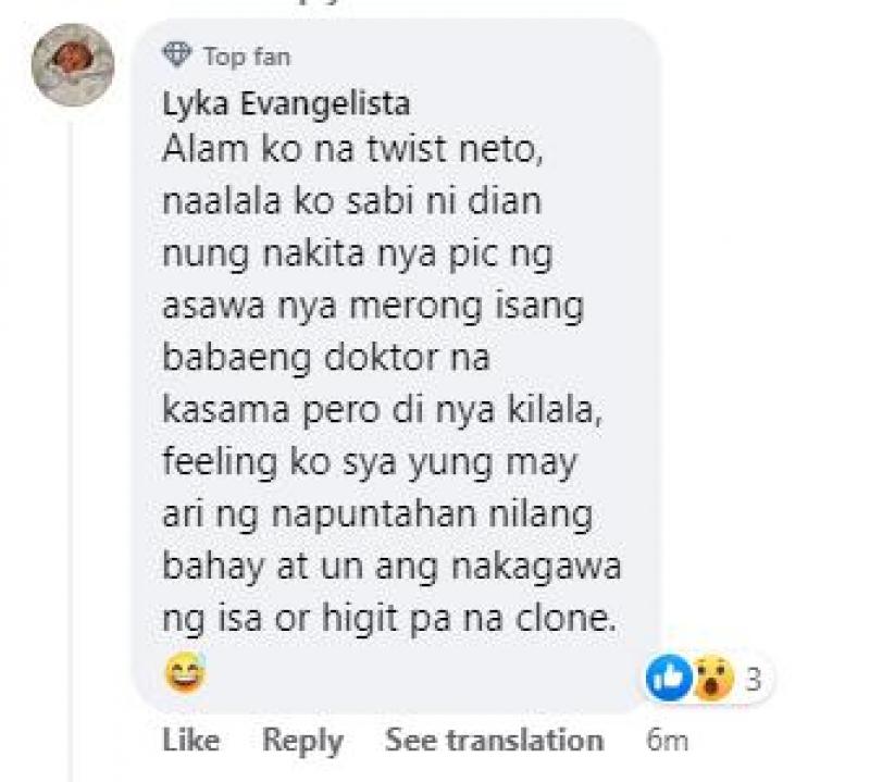 Sa palagay ng Facebook user na si Lyka Evangelista, may kinalaman ito sa babaeng nakatrabaho ni Dr. Christian (Alfred Vargas) na hindi pa rin tukoy ni Diane (Katrina Halili) kung sino.
