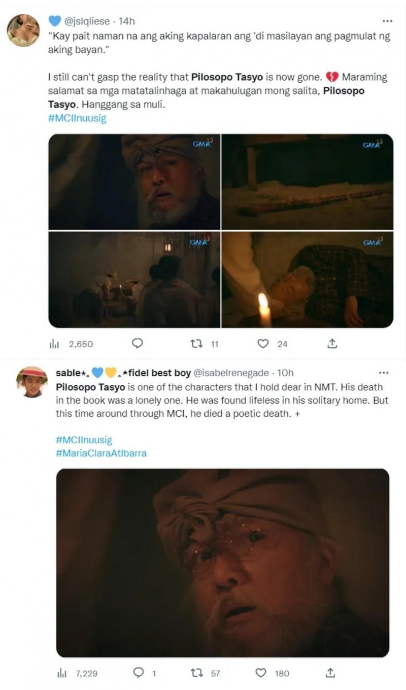 “Pilosopo Tasyo is one of the characters that I hold dear in NMT. His death in the book was a lonely one. He was found lifeless in his solitary home. But this time around through MCI, he died a poetic death,” komento ni @isabelrenegade.