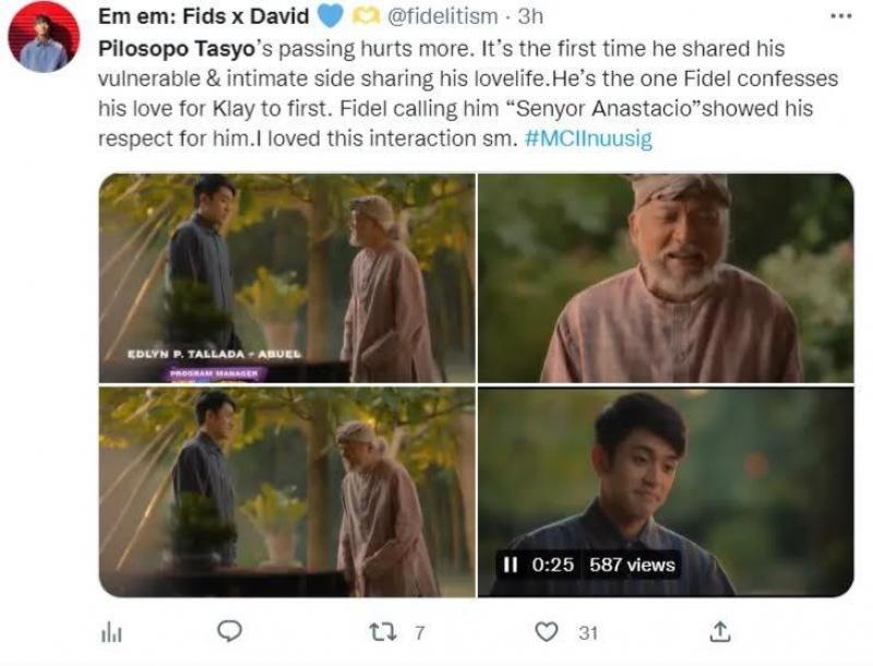 “Pilosopo Tasyo's passing hurts more. It's the first time he shared his vulnerable & intimate side sharing his love life. He's the one Fidel confesses his love for Klay to first. Fidel calling him “Senyor Anastacio” showed his respect for him. I loved this interaction so much. #MCIInuusig” sulat ni @fidelitism.