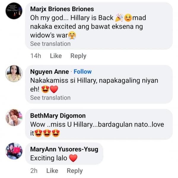 Narito ang ilang reaksyon at komento ng viewers sa pagdating ni Hillary sa Widows' War: