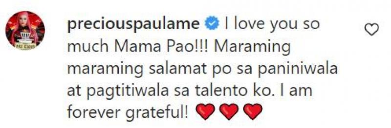 Precious Paula Nicole then expressed his sincerest gratitude and love to the reality show's host, saying, “I love you so much Mama Pao!!! Maraming maraming salamat po sa paniniwala at pagtitiwala sa talento ko. I am forever grateful! [heart emoji].”