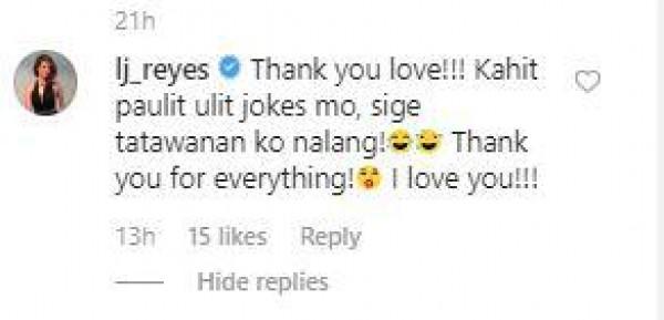 She wrote, “Thank you love!!! Kahit paulit ulit jokes mo, sige tatawanan ko nalang! Thank you for everything! I love you!!!”