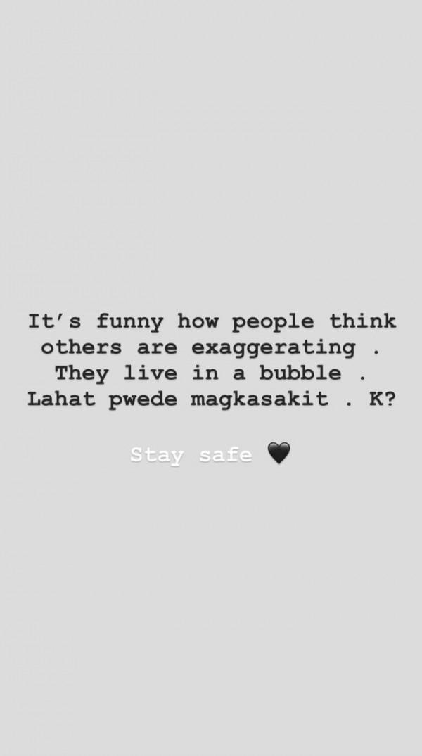 She then continued on saying, “It's funny how people think others are exaggerating. They live in a bubble. Lahat pwede magkasakit. K?