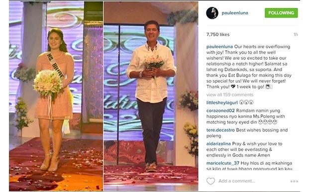 Ayon kay Pauleen Luna, "Our hearts are overflowing with joy! Thank you all to the well wishers! We are so excited to take our relationship a notch higher! Salamat sa lahat ng Dabarkads, sa suporta. And thank you Eat Bulaga for making this day so special for us! We will never forget! Thank you! 1 week to go!"