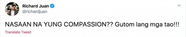 “Nasaan na 'yung compassion?? Gutom lang mga tao!!!” he wrote.